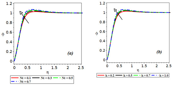 The influence of the Dufour number and the Soret number on the temperature distribution is shown in Figure 5a. In this figure, one sees an upward shift of the thermal curves with increasing . Figure 5b shows the effect of the Dufour number and the Soret number on the solutal concentration. Increasing the Soret , while decreasing the Dufour number , results in an upward shift of mass concentration. Figure 6a,b show that the solutal concentration increases by increasing the values of and .