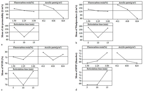 Main effect plots of: (a) air permeability (L·m−2·s−1); (b) windproofness (L·m−2·s−1); (c) WVPI (%); and (d) RWP (Schmerber).