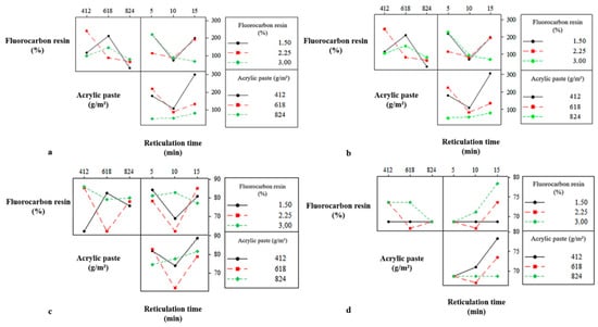 Interactions between the different studied factors when analyzing the water vapor permeability index are represented in Figure 2c. It can be noticed that there were insignificant interactions between the reticulation time and the fluorocarbon resin when the first parameter was varied from 5 to 10 min and the quantity a fluorocarbon resin was maintained at 1.5% and 2.25%. The same ascertainment was made when the reticulation time was varied from 10 to 15 min and the used acrylic paste quantity was equal to 412 or 618 g·m−2.