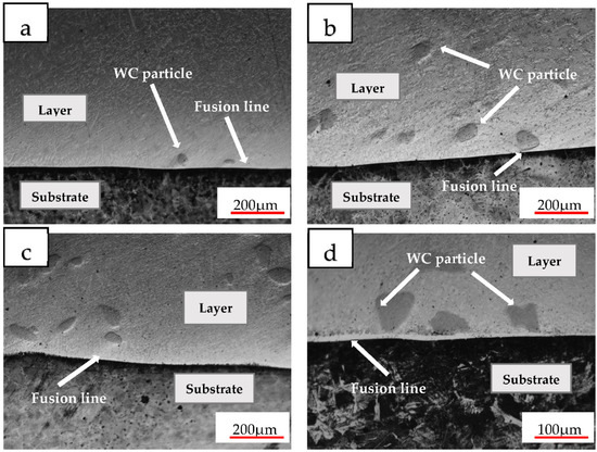 Figure 2 shows the OM diagram near the fusion line of the coatings with different WC contents. It can be seen that WC particles are deposited near the fusion line. With the increase in WC content, the deposition particles increase significantly. A bright white plane crystal fusion line can be seen at the junction of the coating and the substrate. The fusion line is smooth and flat without defects such as pores, cracks or inclusions, which proves that a good metallurgical bond is formed between the coating and the substrate. During the melting process of the molten pool, more undissolved WC particles are deposited at the bottom due to the higher density of WC. Because near the substrate, the temperature is low, the heat dissipation rate is fast and the degree of subcooling is large, so the molten pool solidifies faster, and the undissolved WC particles are deposited near the fusion line and will not contact the substrate.