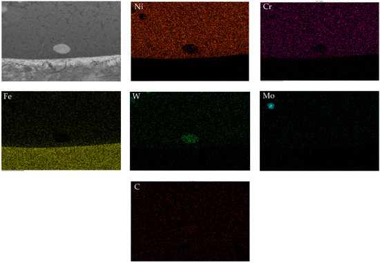 Figure 3 shows the element distribution map of the surface scan in the 10 WC coating. Ni, Cr, W and Mo did not diffuse into the matrix, and a small amount of Fe diffused into the coating without obvious segregation. Ni and Cr elements are uniformly dispersed in the coatings, and the dark stripe precipitates are enriched phases of Cr. Except for the undissolved Mo and WC particles in the field of view, the distribution of W, Mo and C are relatively uniform, and the atomic diffusion is relatively sufficient.
