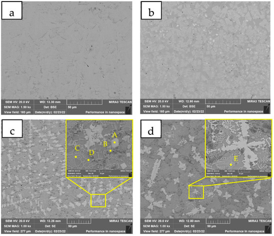SEM image of the different coatings (a) 0 WC; (b) 5 WC; (c) 15 WC; (d) 20 WC. A—M7C3 type carbide hard phase, B—Cr-rich carbide hard phase, C—Secondary dendritic structure, D—Substrate structure, E—High melting point particle.