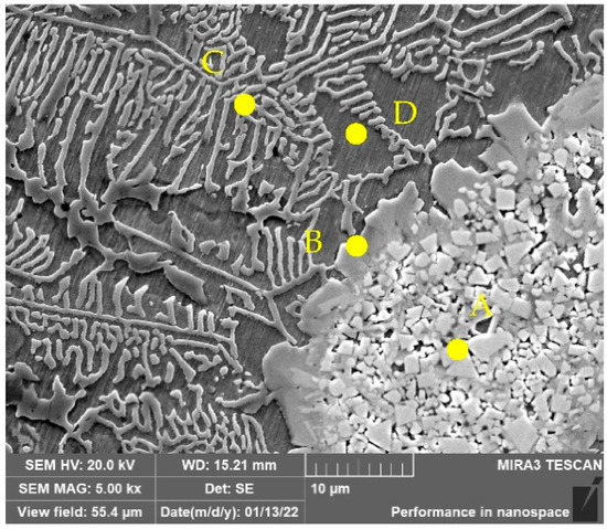 SEM image of the undissolved WC particles in the 5 WC coating. A—WC particles, B—The melting area of WC particles, C—Dendritic structure, D—Substrate structure.