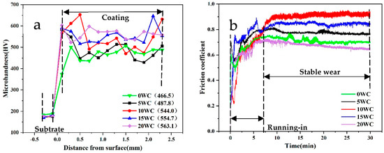 Hardness tests were carried out, and the results are shown in Figure 6a. The average hardness is shown in it. The hardness of the coatings is in the form of “low in the middle and high at both ends”. On the one hand, due to the high density of WC particles, more incompletely melted WC particles are deposited at the bottom of the coating, resulting in high hardness at the bottom of the coating. On the other hand, during the solidification process of the molten pool, the bottom is in contact with the matrix with faster heat dissipation, and the top is in direct contact with the air. The degree of subcooling is large, the cooling rate is fast, and the grains have no time to grow and coarsen. It is similar to the strengthening effect of “quenched martensite”, so the hardness is high. In addition, the hardness of the coatings fluctuates greatly. Because plasma cladding is a rapid cooling and rapid heating process, it is inevitable that the segregation of the tissue or components will occur. The C content in the surrounding area of WC melting is higher, and the hardness is often higher than that of the substrate area. The microhardness of the coatings improves with the increase in WC content. The 20 WC coating has the highest average hardness (563.1 HV), which is about 3.25 times that of the Q235 substrate. The increase in coatings hardness is mainly the result of the comprehensive effect of fine carbide dispersion strengthening, solid solution strengthening, hard phase strengthening and interface strengthening between the hard phase and the matrix generated by the diffusion of C atoms.