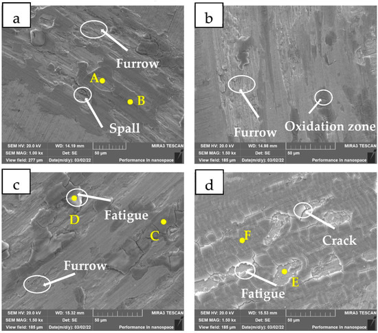 SEM images of different coatings after wear (a) 0 WC; (b) 5 WC; (c) 15 WC; (d) 20 WC. A—The spalling pit, B, C—The oxidized area, D—The fatigue wear area, E—Oxidation layer peeling pit, F—Crack.