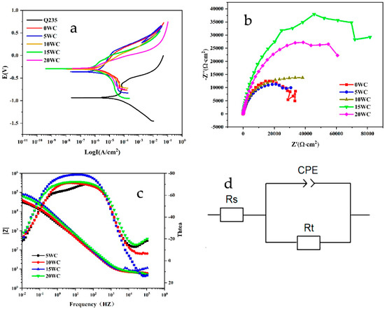 Figure 8b is the Nyquist diagram of the coatings with different WC contents. Different samples all show relatively uniform capacitive arc. Except for the 5 WC coating, the capacitance arc radius of the other coatings is larger than that of the 0 WC coating, which proves that WC is beneficial to reduce the charge transfer resistance during the electrochemical corrosion reaction, and is less prone to surface corrosion. Among them, the 15 WC coating has the largest capacitive arc radii. Rt is the surface charge transfer resistance, which is the equivalent polarization resistance. Its Rt value is 86,797 Ω·cm2, indicating that its corrosion resistance to NaCl solution is the best, which is consistent with the result of the polarization curve. Continued addition of WC will reduce the Rt value of the coating, indicating that excess WC will lead to a decrease in the equivalent polarization resistance value, thereby affecting its corrosion resistance in 3.5 wt.% NaCl solution, which is also consistent with the results shown by the polarization curve.