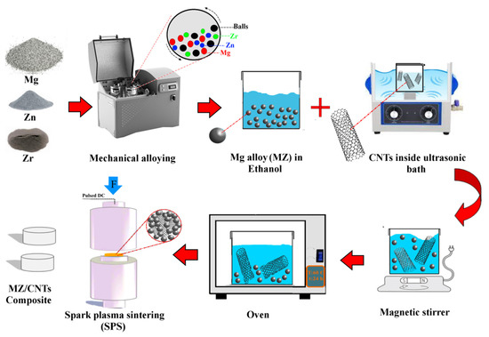 Pure Mg (99.5%, <10 µm), Zn (99.9%, <3 µm), and Zr (99.9%, <3 µm) powders were obtained from Sigma Aldrich, USA. Multi-walled CNTs (diameter = 5–30 nm, length= 5–10 µm and purity = 95%) were provided by Platonic Nanotech Pvt. The SBF solution was purchased from ESPADANA Co., Iran. Fabrication of the base alloy with mechanical alloying method; Mg−2.5Zn−0.5Zr powders were prepared in a planetary ball mill. The enclosed powders were placed in sealed 120 mL steel containers rotating at 300 rpm, and a mixture of balls (Ø = 10 mm balls with 4.07 g mass and Ø = 20 mm balls with 32.65 g mass) were placed in the containers (the ratio of balls to powder was about 20:1). Moreover, in order to prevent the oxidation of the raw materials, the air was taken out of the chambers and replaced by a neutral gas, argon (<3 ppm oxygen). In order to make Mg−3Zn−1Ca−0.5Zr/xCNTs (x = 0, 0.3, 0.6, 0.9) nanobiocomposites, the SPM method was used. For this purpose, CNTs and ethanol were put in the ultrasonic device to break the molecular bonds and prevent the van der Waals bonds between the CNTs. Then, Mg alloy was added to the solution and mixed for 2 h at a speed of 600 rpm at a temperature of 40 °C. Finally, it was placed in an oven with controlled atmospheric conditions for 1 day to dry. Composite powders with CNT values of 0, 0.3, 0.6 and 0.9 were labeled as MZ, MC1, MC2, and MC3, respectively. The composite powders were sintered in an SPS chamber at a temperature of 570 °C and a pressure of 40 MPa for 10 min. A schematic of the sample formation steps is represented in Figure 1.