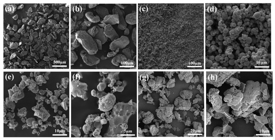 SEM micrographs of (a,b) Mg, (c,d) Zn, (e,f) Zr and (g,h) MZ powders.
