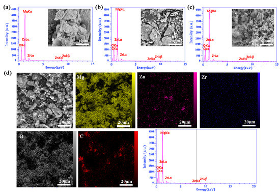 Electron microscope image and EDX measurements of as-prepared samples are shown in Figure 4. According to the obtained results, Mg, Zn, Zr and O elements for the MZ alloy matrix (Figure 4a) and Mg, Zn, Zr, O and C elements for different amounts of CNT in the MZ/CNTs composites (Figure 4b–d) were identified. The pictures show the uniform distribution of the alloy elements by the mechanical alloying method, and the almost uniform distribution of the carbon reinforcement in the background phase by the SPM technique (Figure 4d).