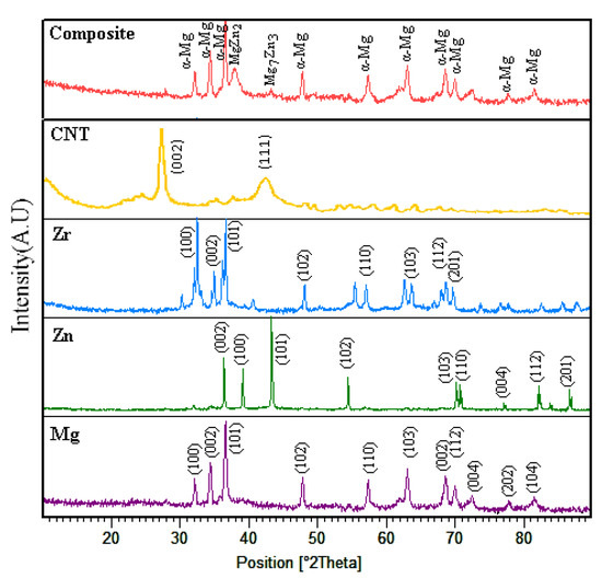 XRD patterns of pure Mg, Zn, Zr and MZ/CNTs composite.