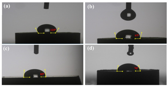 Contact angles of (a) MZ, (b) MC1, (c) MC2 and (d) MC3 composites after SPS process.