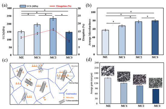 (a) Microhardness value, (b) ultimate compressive strength (UCS) value of MZ, MC1, MC2 and MC3 composites, (c) schematic showing the Orowan looping mechanism after dislocations gliding over and bypassing the CNTs, (d) OM image and grain size calculations of MZ, MC1, MC2 and MC3 composites.
