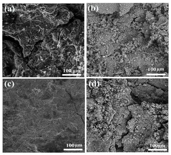 Figure 9—shows the surface morphology of Mg alloys and MZ/CNTs composites after being immersed in SBF for 7 days. In Figure 8a, many deep cracks and pitting corrosion are observed, indicating severe corrosion damage to the Mg alloy. However, the MZ/CNT composite with a small amount of CNTs has fewer cracks and smaller pits (Figure 8b,c). Hard corrosion and deep cracks were observed with increasing CNT content (Figure 9d).