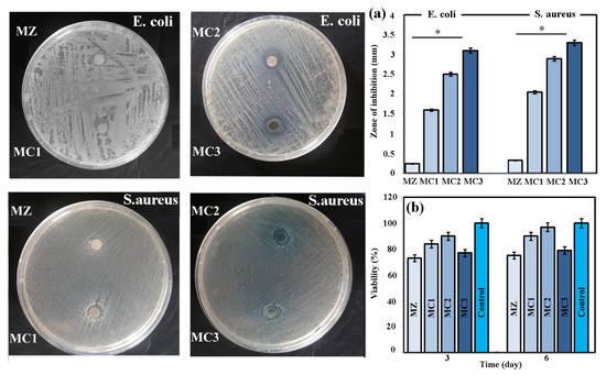 (a) Antibacterial activities by the disk diffusion test against both gram-positive (S. aureus) and gram-negative (E. coli) and (b) cell viability of MG63 cells cultured for various times on the MZ, MC1, MC2 and MC3 biocomposites.