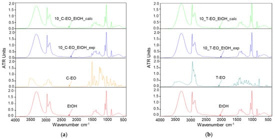 FTIR–ATR spectra of C-EO (a) and T-EO (b) as pure products and diluted in ethyl alcohol (1:10): experimental spectra, respectively coded 10_C-EO_EtOH_exp and 10_T-EO_EtOH_exp (blue spectra) compared to the OPUS-calculated theoretical spectra, respectively code 10_C-EO_EtOH_calc and 10_T-EO_EtOH_calc (green spectra).