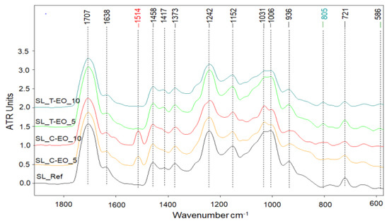 The main absorption bands in the spectra of SL and their assignment based on literature (centralised references in []) are as follows: 3300–3400 cm−1 (–OH stretching), double peak 2926–2858 cm−1 (asymmetric and symmetric C–H stretching in methylene groups), 1707 cm−1 (stretching of unconjugated C=O bonds in carboxylic acids, esters and free aldehydes or ketones), 1636 cm−1 as small shoulder (stretching of conjugated carbonyl, stretching of C=C double bonds), 1457 and 1373 cm−1 (asymmetric bending and deformation of C–H bond in methylene –CH2– and methyl –CH3 groups, symmetric deformations of C–CH3), 1242 cm−1 (O–H bending and C–O stretching of carboxyl and hydroxyl groups overlapping with C–O stretch of –COOR), 1152 cm−1 (C–O–C stretching, C–O stretching in esters and alcohols), broadband from 1031 to 1007 cm−1 (C–O stretching of alcohols, ether/acetal linkage), 936 cm−1 (rocking vibration of C–CH, C–H wagging of di-substituted trans olefins) and 722 cm−1 (CH3 rocking; C–H wagging of cis-olefins). However, in the fingerprint region, some differentiations were visible not only as relative intensity of different absorption peaks but also as specific absorptions due to the EOs components. The SL films modified with C-EO present a new peak (medium intensity) at 1514 cm−1, which could be assigned to the skeletal vibration of the aromatic ring [] and also to the methyl substitution group [] in eugenol and ethyl eugenol, the main chemical components of C-EO. The SL films modified with T-EO present a new peak (small intensity) at 805 cm−1, assignable to the out-of-plane wagging vibration of the C–H band in the aromatic ring (805–811 cm−1, depending on the relative position of substitution), and could be due to the presence of thymol in the composition of T-EO [,]. A trend of small absorption in this region, though not a clearly differentiated peak, can also be observed for the films modified with 10% C-EO, considering the substituted aromatic ring in the structure of eugenol, with a corresponding vibration at 816 cm−1 [].
