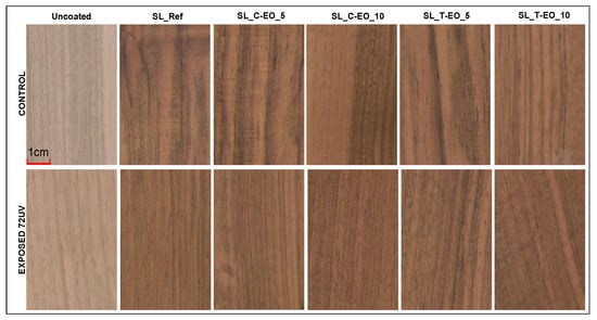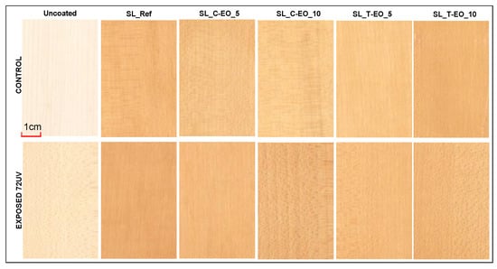 Modified SL polishes by 5% and 10% EOs were further prepared and coded, as presented in Table 1. These proportions of modification were chosen based on previous research on the antifungal properties of the two EOs and their potential for wood conservation, found as appropriate at volumetric concentrations of 5–10% in ethyl alcohol [,,].