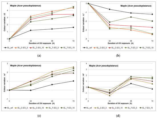 Evolution of colour changes of maple wood (Acer pseudoplatanus) surfaces finished with reference (SL_Ref) and EO-modified shellac solutions (SL_C-EO_5, SL_C-EO_10, SL_T-EO_5, SL_T-EO_10): (a) ΔE; (b) ΔL*; (c) Δa*; (d) Δb*.