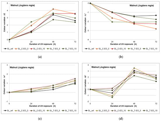 A change in the dynamics of global colour changes, which are more rapid at the beginning of the process and slow down later, results from the pattern of ΔE curves, in accordance with the literature (e.g., []). This evolution change was registered after 24 h UV exposure for maple (Figure 6) and 48 h UV exposure for walnut (Figure 7). This difference between the two wood species under study might be related to a combined protective effect of extractives of walnut and shellac coating in delaying/slowing down UV degradation effects for the examined period. However, this protective effect might be diminished in time as extractives are also sensitive to photo-degradation under the action of light (UV-VIS) [,,]. For both maple and walnut samples coated with reference shellac, a significant lightening associated with extractives degradation was determined after 7 years of indoor exposure to the natural light filtered by window glass (unpublished research data of the authors).