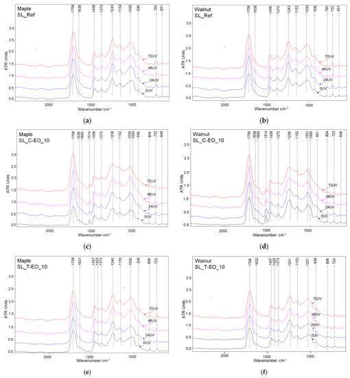 The results of the FTIR investigation of the coated samples prior to and after different periods of UV ageing are cumulated in Figure 8 for the two species under investigation and three types of shellac solutions: the unmodified reference (SL_Ref) and the solutions modified by 10% EOs (SL_E-EO_10, SL_T-EO_10).
