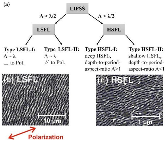 A lot of work has been performed to study the formation mechanism of the femtosecond laser on LIPSSs. A LIPSS can be classified according to the characteristic ratio of its spatial periods (Λ) to the irradiation wavelength (λ) and the polarization direction of the linear laser beam used to produce them [37,38,39]. Figure 1a provides a general classification of LIPSSs observed on irradiation with femtosecond laser pulses. The period of low spatial frequency LIPSSs (LSFL) is slightly equal to or less than the laser wavelength. They are perpendicular (LSFL-I) or parallel (LSFL-II) to the polarization direction of the laser. In contrast, the period of high spatial frequency LIPSSs (HSFL) is smaller than half of the irradiation wavelength and may be formed as deep surface gratings (HSFL-I, depth-to-period aspect ratio A > 1) or as shallow surface gratings (HSFL-II, depth-to-period aspect ratio A < 1). Figure 1b [37] provides an LSFL-I type structure on a Ti6Al4V surface after femtosecond laser irradiation. The double arrows indicate the direction of the laser beam polarization. The LSFL structure has a period of ΛLSFL~620 ± 80 nm and is perpendicular to the polarization direction of the laser beam. Figure 1c shows the HSFL-II structure formed on the laser irradiation surface [40]. The HSFL structures have periods of less than 100 nm (ΛHSFL~80 ± 20 nm) and are parallel to the direction of the laser beam polarization.