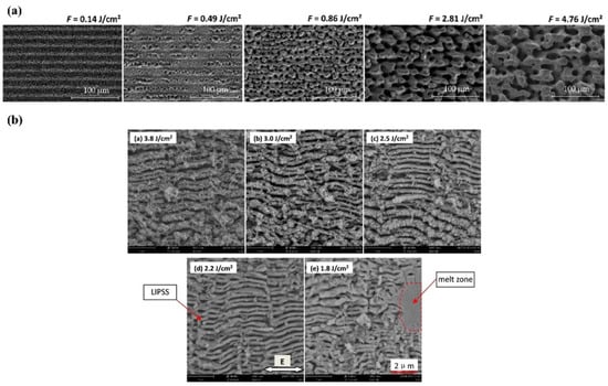 The laser fluence has a large impact on the morphology of LIPSSs; different types of LIPSS are obtained by varying the laser fluence on the same material [49,50,51,53,54]. J. Bonse [55] obtained both LSFL and HSFL on the surface of titanium by varying the laser fluence, and the laser fluence affects the periodicity of LIPSSs. Georg Schnell et al. [50] report the formation of nano- and micro-structures on Ti6Al4V evoked by different scanning strategies and fluences with an fs-laser. Figure 3 shows the SEM microstructure images of the femtosecond laser pulses of different energy fluences. As shown in Figure 3a [50], the surface morphology is LIPSS when the laser fluence is 0.14 J/cm2, the surface topography is micron spacing grooves when the laser fluence is 0.86 J/cm2, and the surface morphology is cones and micro craters at a laser fluence of 4.76 J/cm2. Shi-zhen Xu et al. [56] explore the influence of laser scan fluence on the formation of micro/nanostructures on the surfaces of fused silica. At a fixed laser scan speed (1.7 mm/s), the HFSL was observed at a low fluence region (1.8–2.5 J/cm2). A transition from HSFL to LSFL occurred when a critical energy fluence threshold (2.5 J/cm2) was exceeded (Figure 3b). The phenomenon can help to form process design guidelines to tailor large-scale surfaces with self-organized features, and can be used in future studies. For most materials, the periodicity of LIPSSs increases as the laser fluence increases. Better surface topography can be obtained at a low laser fluence approximate to the material ablation threshold. To achieve high efficiency for industrial applications, the ablation rate is increased by increasing the laser fluence. However, the processing quality is significantly reduced due to the thermal damage caused by the highly effective penetration depth. To avoid adverse effects on the sample, a suitable fluence is an advantageous condition to realize cold processing.