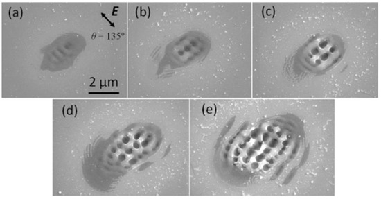 Ref. [58] SEM images of periodic structures induced on the surface of a silicon wafer by femtosecond laser at a fixed laser fluence (F = 0.22 J/cm2) with different pulse number (N): (a) N = 2, (b) N = 4, (c) N = 6, (d) N = 8 and (e) N = 10, respectively. The arrow shows the direction of laser polarization.