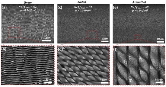 Ref. [57] The SEM images depicting line scans produced by linearly (a,b), radially (c,d), and azimuthally polarized (e,f) beams, respectively, at v = 0.5 mm/s, and F = 0.24 J/cm2. The images (b,d,f) are higher magnifications of an area inside the red dashed squares and reveal the biomimetic shark skin-like morphology of the processed areas.
