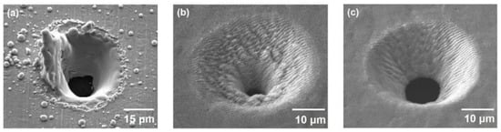 Ref. [70] SEM images of micro-holes on Invar were processed at three pulse durations of (a) 10 ns, (b) 15 ps, and (c) 300 fs, respectively. The ns laser parameters are F = 5 J/cm2, f = 50 Hz, and λ = 248 nm. For the ps and fs laser, F = 0.29 J/cm2, f = 200 kHz, and λ = 1035 nm.