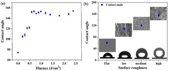 Ref. [93] (a) The measured contact angle values as a function of laser fluence. (b) The contact angle values measured on the initial surface roughness at low fluence. Corresponding surface morphologies are depicted in the insets.
