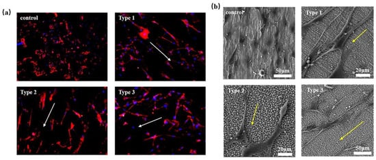 Ref. [103] Mesenchymal stem cells’ adhesion on the polished surfaces and three types of nano-ripples after 72 h of incubations. (a) Fluorescence images of cytoskeletons; (b) SEM images of MSCs’ adhesion states for the three types of nano-ripples. The both arrow indicates the direction of cell diffusion.