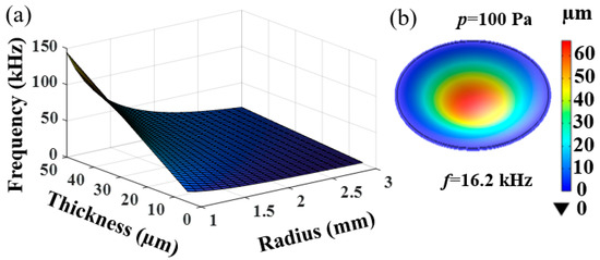 (a) Simulation of resonant frequency versus the thickness and radius of the diaphragm and (b) a resonant mode of the diaphragm at a frequency of 16.2 kHz.