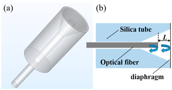 The proposed device’s schematics are shown in Figure 2. Figure 2a illustrates the model with a piece of optical fiber inserted into the silica tube. Light through the fiber was partly reflected from the fiber end facet/air interface and the air/diaphragm interface due to the Fresnel reflection, as shown in Figure 2b. The diaphragm’s thin thickness and light absorption allowed the output interference signal to be described using two-beam interference, which can be given as [29]: