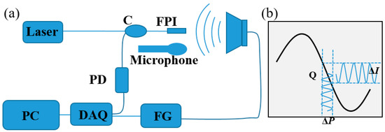 After fabricating the device, the acoustic sensing characterization of the CNCs–PVA-based FPI device was experimentally set up as shown in Figure 3a. In the test, a tunable laser was used as the source. Light was transmitted into a circulator (C) and then reflected by the FPI device. The reflected signal was detected by a photodetector (PD) and then acquired using a data acquisition (DAQ) card (NI-6211). A loudspeaker connecting a function generator (FG) was used to generate low-frequency acoustic waves. A standard microphone (GM1356) was used as a reference to characterize the generated acoustic wave pressure, which was close to the sound source. To obtain a maximal linear measuring range, the laser wavelength was tuned at the quadrature point, as shown in Figure 3b, which illustrates that a high sensitivity could be achieved when the Q factor was higher.