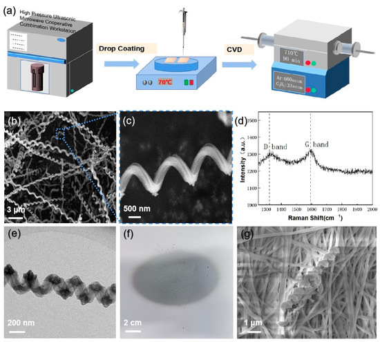 (a) Flow chart of CNCs preparation using the microwave heating method and CVD; (b) SEM image of CNCs; (c) SEM enlarged image of the partial CNC; (d) Raman shift of the CNCs; (e) TEM image of the partial CNC; (f) optical photograph of the fabricated composite film; and (g) SEM image of the fabricated film with CNCs.