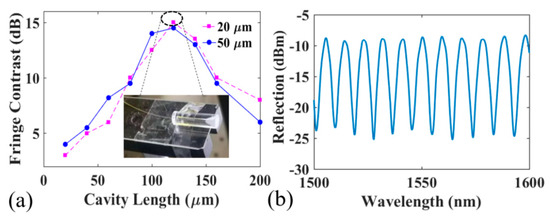 To characterize the fabricated device, a few films with different thicknesses were used to fabricate the device. First, we investigated the effect of thickness on the fringe contrast, and noted that the maximal fringe contrast could be obtained when the intensities of two reflected lights were the same. Figure 5a shows the measured fringe contrast versus the cavity length when the thickness of the diaphragm was 20 and 50 µm, separately. Thickness did not have an obvious effect on the reflection due to a large absorption of the material. The fringe contrast increased as the cavity length increased; however, it decreased as the length increased further. A maximal fringe contrast of 15 dB was obtained when the cavity length for the composite film was approximately 120 µm.