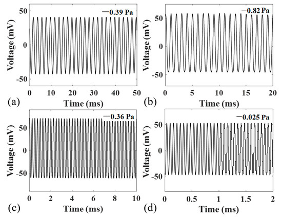 The measured time–domain response of the FPI sensor for the detection of acoustic waves with frequencies of (a) 500 Hz, (b) 1 kHz, (c) 4 kHz and (d) 16 kHz.