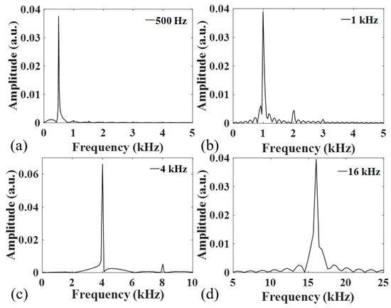 Frequency spectra of the detected signals with frequencies of (a) 500 Hz, (b) 1 kHz, (c) 4 kHz and (d) 16 kHz.