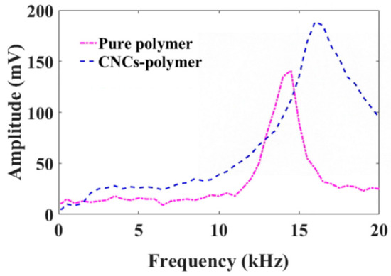 Next, as shown in Figure 7, the frequency spectra of the detected signals clearly indicated that only one frequency was obtained, as with the generated signal. To evaluate the frequency bandwidth, the input acoustic pressure was kept constant at 0.1 Pa and the frequency was swept from 100 Hz to 20 kHz. Figure 8 shows the sensor’s frequency response, which had the largest amplitude at a frequency of 16.2 kHz, in accordance with the simulation. The sensitivity was evaluated as 1.89 V/Pa. However, the resonant frequency of the pure PVA polymer with a similar geometric size was approximatively located at 14 kHz. This difference had two primary causes: the difference in material properties, and improper fabrication, as the membranes’ parameters could be slightly different. Notably, the mechanical response of a membrane did not obviously change, as the resonant frequency was slightly changed. To facilitate a direct comparison between the acoustic wave pressure responses of the two membranes, the optical Q-factors were the same, according to Equation (4). The sensitivity at the resonant frequency was evaluated as 1.35 V/Pa, which was lower than that of the device with the fabricated composite membrane. During the frequency range from 2 to 10 kHz, the frequency responses of the two sensors were relatively flat. It was noted that the resonant frequency of the sensor could be designed and tuned by changing the content of CNCs as well as the dimension of the diaphragm.