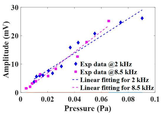 To investigate sensor sensitivity at non-resonant frequencies further, two signals (at frequencies of 2 and 8.5 kHz) were applied. In the experiment, acoustic pressure increased from 5 to 100 mPa, and detected signals were obtained, as shown in Figure 9. A linear fitting was used. Amplitude versus pressure can be expressed as: