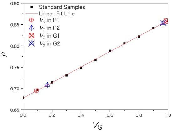 The red line is a linear fit of the volume fraction of xylene vG and density ρ of standard samples (marked in black squares). The real samples of recovered extractants (P1, P2 and G1, G2) are marked by larger symbols along the fitted line. ρ is in unit of g/mL.