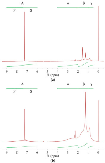 NMR measurements were performed on a Bruker BioSpin GmbH instrument at 25 °C. CDCl3 was used as the deuterated solvent. A 50 mg sample was sufficiently mixed with 0.5 mL of CDCl3 and transferred into a 5 mm NMR tube for one-dimensional (1D) liquid 1H-NMR characterization. Pulse sequence was zg30 and pulse width was 9.27. Number of scans was 16 and receiver gain was 101. Relaxation delay was 20.0 s and acquisition time was 4.0894 s. Spectrometer frequency was 400 MHz and flip angle was 30°. Acquired size was 32,768 and spectral size was 65,536. The spectral width was 8012.8. The NMR spectra were analyzed via MestReNova software (version 6.1.0-6224 for Windows). The chemical shift of TMS was set as 0 ppm for reference. The n-heptane of AR purity was measured firstly to get the relative ratio of residual solvent (chloroform) signal in deuterated solvent to the TMS signal. The ratio was found to be 0.48 ± 0.04. Based on this ratio and TMS signal, the area for chloroform signal was subtracted and the rest areas integrated for the selected ranges in NMR spectrum were normalized to sum 1 for ease of comparison. Each real sample was measured 3 times independently to calculate the mean and deviation of integrated areas.