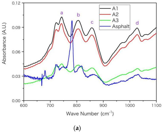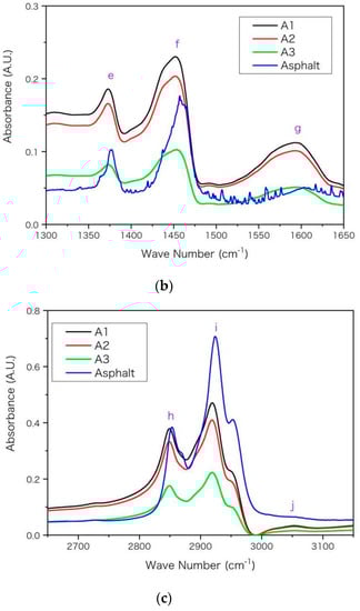 The aromatic rings can only influence a small proportion of chemical bonds adjacent to the rings while asphalt and asphaltene may have dramatically different proportion. In Table 6, the discrepancy between asphaltenes (A1, A2 and A3) is relatively smaller than that between asphaltenes and base asphalt. For example, the discrepancy of location for peak g is only 3 cm−1 between A1 and A3 while it is 11 cm−1 between A1 and asphalt, according to Table 6. The reason may be that the proportion of chemical bonds influenced by aromatic rings increases more dramatically (larger discrepancy) from asphalt to asphaltene A3 than it increases from asphaltenes A3 to A1. From asphalt to asphaltene A3, the asphaltene percentage increases from below 20% to nearly 100%. Such a shift of peak location was also observed for asphaltenes and even resins near 1603 and 1030 cm−1 in previous FTIR spectra [6]. Moreover, as asphalt was a complex mixture and its four components had significantly different spectra [6], the peak position and height may vary with the proportion of its components. Compared with asphaltenes, the saturates lacked peaks near 1030 cm−1 (peak d) and 1600 cm−1 (peak g) [6], owing to lacking S and O elements and double-bond in their molecules. The peak around 1377 cm−1 is used for the quantification of poly(styrene-b-butadiene-b-styrene) (AASHTO T302-15, JT/T 1329-2020) or other modifiers in asphalt [31,33,34]. According to Table 6, the position of this peak (e) moves towards a lower wave number from base asphalt to asphaltenes; thus, its specific position may vary with asphaltene proportion and should be checked carefully when calculating peak height or area integral for quantification.