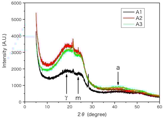 The XRD spectra of asphaltenes mainly have 3 characteristic peaks of γ, 002 and 10 band, which are labelled as γ, m and a, respectively, in Figure 4. The X-ray wavelength λ is 1.5406 angstrom (Å). According to their diffraction angles (2θ) listed in Table 7 and the Bragg equation d = λ/(2 sinθ) [35,36,37], the characteristic lengths d are calculated and listed in Table 7. The peaks γ and m reflect the packing structure of saturated alkyl chains and aromatic rings, respectively, while the peak a is related to the size of the aromatic sheet [35,37,38]. From A1 to A3 in Table 7, the decrease of average distance dY indicates a denser packing of alkyl chains, while the increase of layer spacing dm implies a looser packing of aromatic rings. According to previous EA, IR and NMR results, the unsaturation, polarity and aromaticity of asphaltenes decrease while the number of substituted branches and fraction of methyl groups increase from A1 to A3. Thus, the packing of aromatic rings becomes looser owing to more substituted branches on aromatic rings and smaller inter-molecular interactions, while the packing of alkyl chains becomes denser because of the increased fraction of free chain (methyl) end. The decreased ring fraction and molecular unsaturation is also helpful to decrease the molecular rigidity and beneficial to the packing of alkyl chains. Therefore, the variation trend of molecular structure of asphaltenes reflected by XRD spectra is consistent with the previous experimental results.