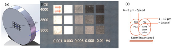 Laser strategy on sample: (a) disc with laser ablation, (b) DLC matrix of samples, and (c) schema of linear and lateral overlapping.