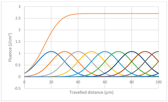 In this paper, energy is calculated according to the Gaussian distribution shown in Figure 2. This is a consequence of the overlap shown in Figure 1, where we can have between 28,125 and 375,000 shots to produce the part. The ratio between the maximum and minimum fluence is 36.5/2.7 = 13.5, which is equal, as expected (without rounding errors), to the ratio of Sp and Hd 4000 × 10/(3000 × 1) = 13.3 or the ratio of the number of shots 375,000/28,125 = 13.3.