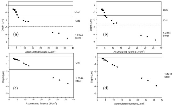 As we can see in Figure 3, there is a clear linear relationship between texturization depth and the amount of energy applied to the surface or laser fluence. If a regression is made between energy fluence in x and removal depth in y, the removal speed of material can be obtained. Figure 3a,b shows a 1.5 µm DLC layer on top of another 1.5 µm anchor layer on CrN before reaching 1.2344 steel substrate. For the DLC layers, there is clearly a much faster removal speed than in CrN and steel. This higher speed can be explained by the darker color of the layer. Being darker, the DLC layer absorbs more energy instead of reflecting that energy. The change of speed on the DLC layer can be seen clearly in Figure 3a,b, where once the DLC layer is removed, the removal speed at the CrN anchor layer is slower. The CrN and steel samples, having similar colors, reflect a similar amount of energy and show similar trends.