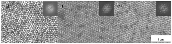 Figure 4a shows the effect of reaching steel, while Figure 4b,c reaches the CrN coating layer. The greatest orders of 2D-FFT are obtained on CrN. Results are very similar when texturing directly a CrN sample or a DLC sample with CrN substrate. The range of periodicity is around 500–800 nm. The main difference between the 2D-FFT in CrN depth is the order and concretion of the main directions of the texture. SEM micrography allows us to see more order. There are clearly straight lines at 36, 97, and 155 degrees in Figure 4b. These lines can be seen in the SEM micrograph from LIPSS or in the 2D-FFT, where the circle of frequencies observed previously is clustering at six points, indicating the main distances and their linear combinations or harmonics of the structure, as in Romano et al. [24].