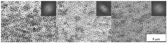 A morphological analysis of all samples was performed by SEM JEOL JSM-6460 (Jeol, Tokyo, Japan) and AFM Nano-Observer (CSInstruments, Les Ulis, France). SEM micrographs were taken to obtain a clear description of the surface and to measure any possible far-range order and its periodicity. SEM micrographs were transformed by a two-dimension fast Fourier transform (2D-FFT) using MatLab (MathWorks, Natick, MA, USA) to decompose the image into the characteristic frequencies and to know if the frequencies are discrete (far-range order) or distributed (less or no order).