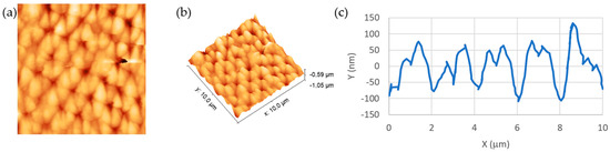 A 3D reconstruction of the surface by AFM was performed to extract a profile and to determine the vertical dimensions of the texture. In Figure 6, the detail of the most ordered sample, CrN S3500-Hd3 conditions, is shown. By taking the profiles on the angles of the 2D-FFT, λ of the texture can be confirmed but not as precise as with the 2D-FFT. On the profile, made at the main angle of the texture, it was seen that there is a periodicity of 1 µm, corresponding to the 0.94 µm period from the 2D-FFT. As for the height of the sample, the amplitude of one period oscillates between 0.1 and 0.15 µm. Similar structures were measured to obtain hydrophobicity [25]. Hydrophobic structures showed a period and amplitude of 20 µm and submicron periods that were responsible for hydrophobicity. These AFM profiles showed some periodicity when a pattern was observed. This was a clear indication that structured patterns could be detected later by using FFT analysis.